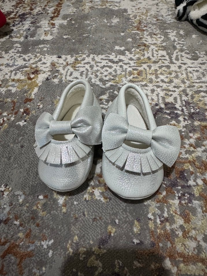 Gri renkli, fırfır ve fiyonk detaylı kız bebek ilk adım ayakkabısı, yumuşak kauçuk malzemeden, modern klasik no yazmıyor 6-9 9-12 uygun