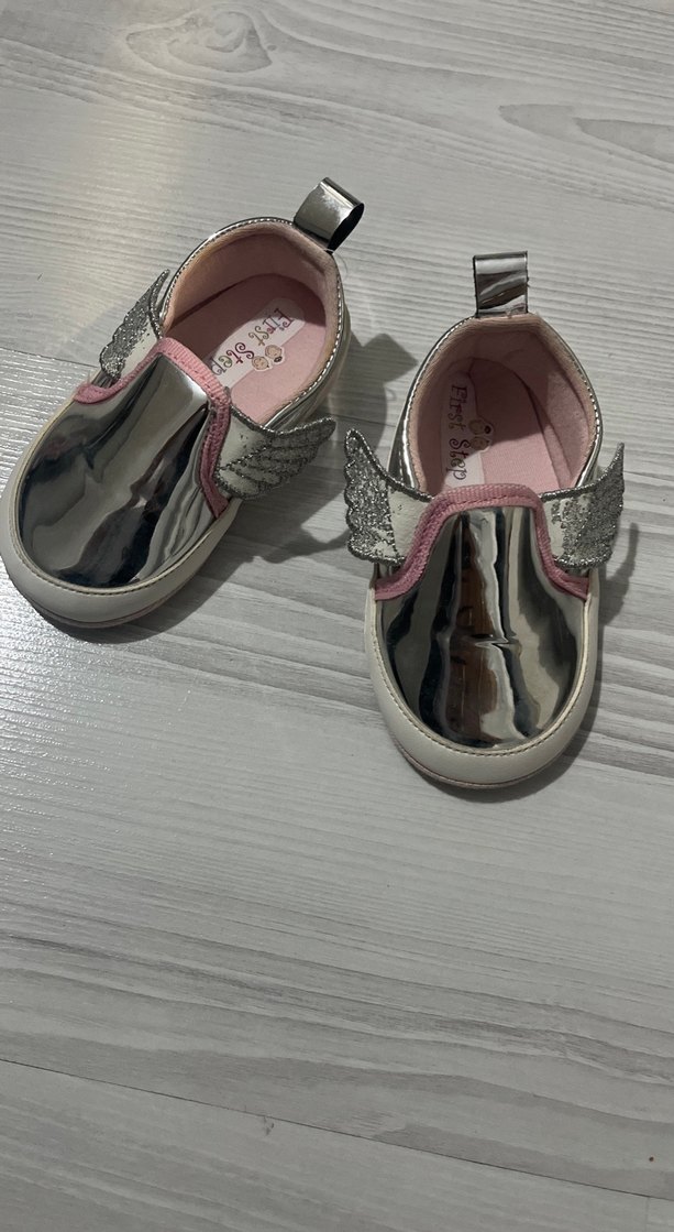 Gri renkli kız bebek ilk adım ayakkabısı, parlak yüzey, cırt cırt kapama ve kanat detaylarına sahip, rahat kauçuk tabanlıdır.