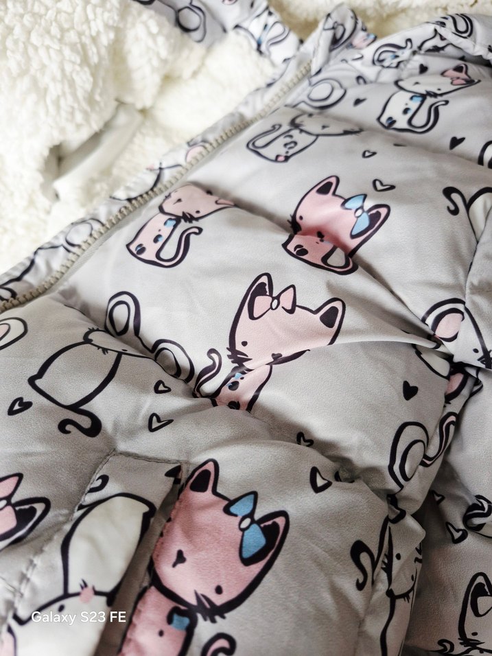 Gri renkli, kapüşonlu ve nakışlı kedi desenleriyle süslenmiş kız bebek kaban. İç kısmı yumuşak kürk detaylıdır. ❄️