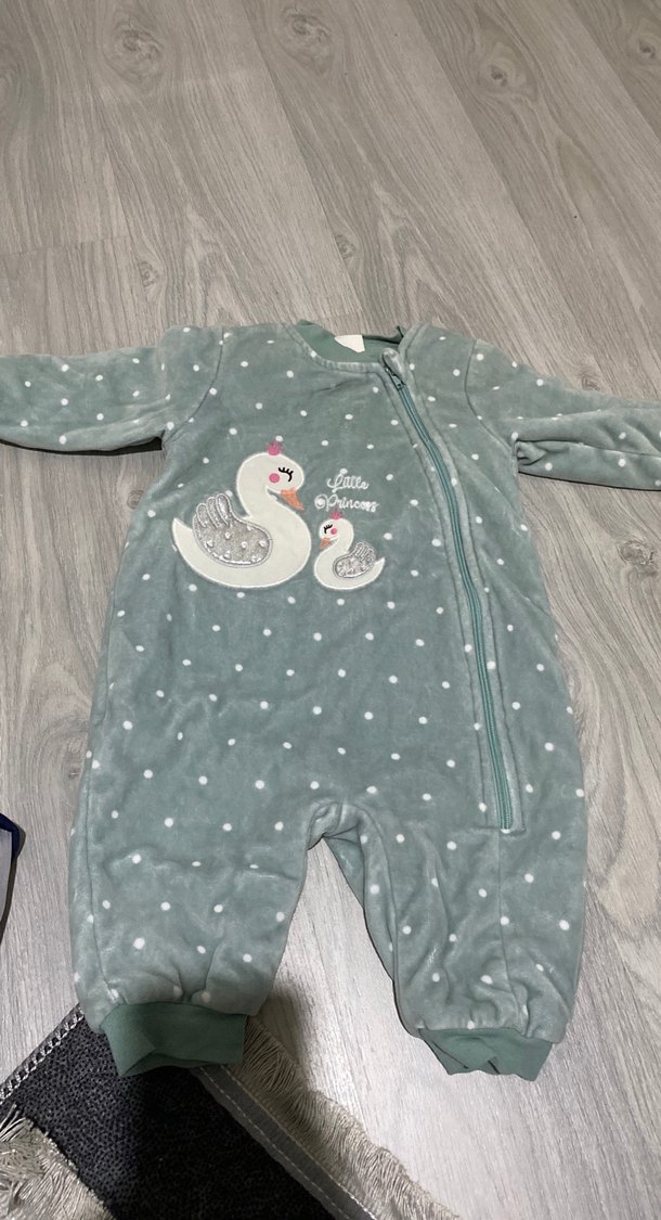 Gri renk, yuvarlak yakalı kız bebek tulumu, fermuarlı ve nakışlı kuğu desenlidir. Beyaz puantiyeli yumuşak kumaştan üretilmiştir. 1 kez giyildi 2 kez yıkandı