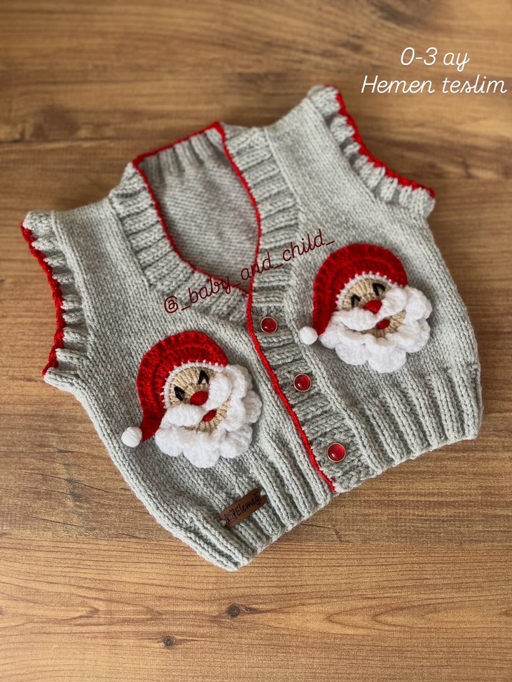 Kız bebekler için gri renkli, fitted kesim örme yelek. Kolsuz, bisiklet yaka ve işlemeli Noel baba desenleri bulunur. 0-3 ay, hemen teslim