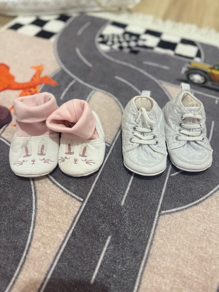 Gri simli ve Beyaz, nakış detaylı kız bebek ilk adım ayakkabısı, rahat ve kolay giyilen birkaç kez giyildi tertemizler görseldeki gibiler
