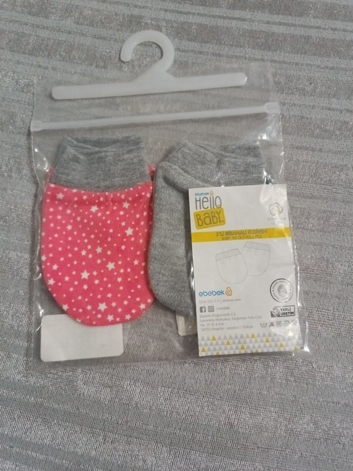 Kız bebekler için gri ve pembe yıldız desenli, yumuşak kumaştan yapılmış eldivenler. Velcro kapama ile rahat ve güvenli kullanım sağlar.