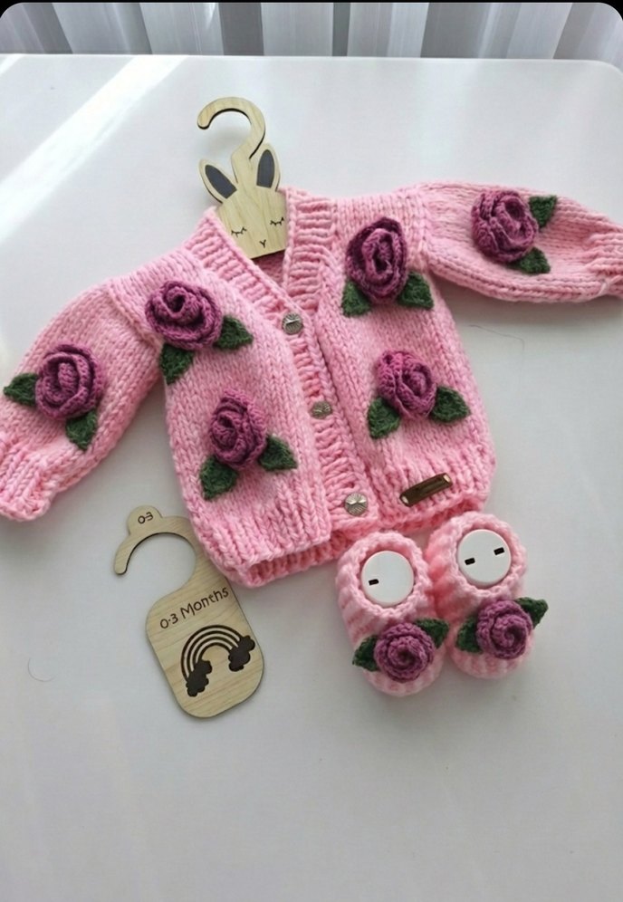 Nakışlı çiçek desenleriyle süslenmiş, uzun kollu pembe örgü hırka ve uyumlu patik takımı. Bohem tarzda, bebeğiniz için şık ve rahat.