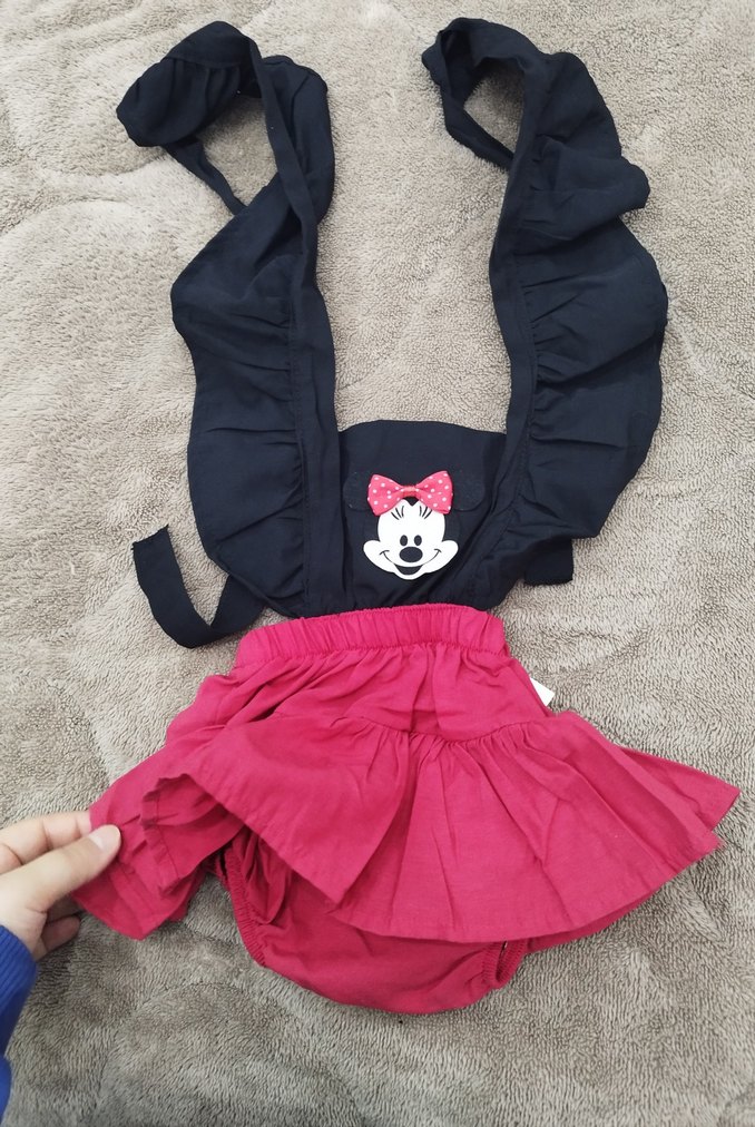 Koyu renkli, pembe fırfırlı etekli ve Minnie Mouse baskılı bebek sling, yumuşak ve rahat kumaştan üretilmiştir 6 ay