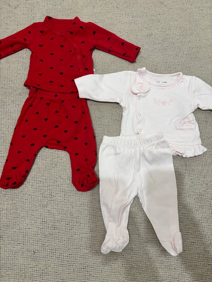 Uzun kollu, ayaklı pantolonlu iki parçalı kız bebek kıyafet seti. Canlı kırmızı ve yumuşak beyaz renk seçenekleriyle rahatlık sunar.