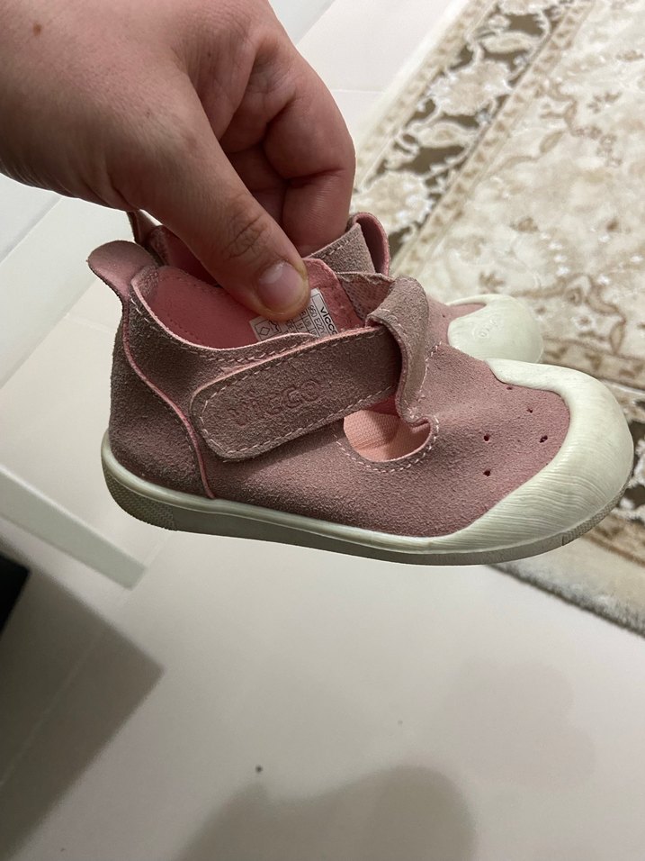 Pembe renkli, cırt cırtlı ve kauçuk tabanlı kız bebek ilk adım ayakkabısı. Pastel tonlarda sade ve rahat bir tasarıma sahip. Temizidir.
