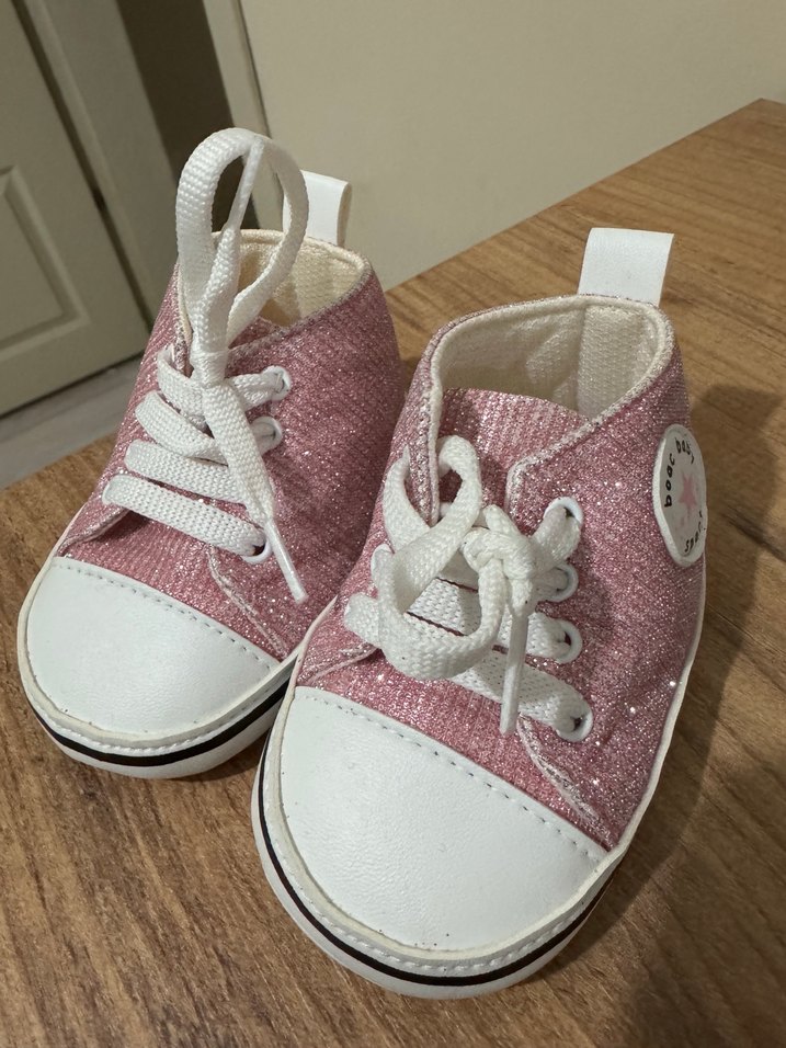 Pembe pastel tonlarda, beyaz bağcıklı, kauçuk tabanlı kız bebek ilk adım ayakkabısı, rahat ve şık sokak stiline uygundur. Yeni kullanmayı unutmusuz