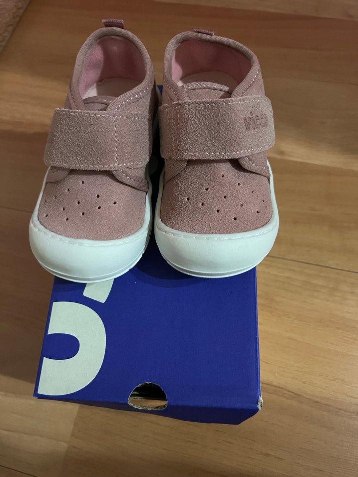 Kız bebek için pastel pembe renkte, cırt cırtlı ve lastik tabanlı ilk adım ayakkabısı.