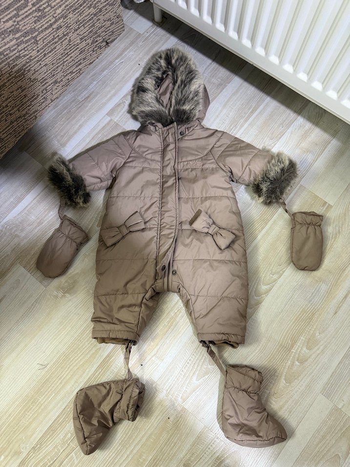 Kahverengi kız bebek tulumu, kapüşon ve manşetlerde kürk detaylı, kesik yaka ve çıkarılabilir eldiven ile patiklere sahip.