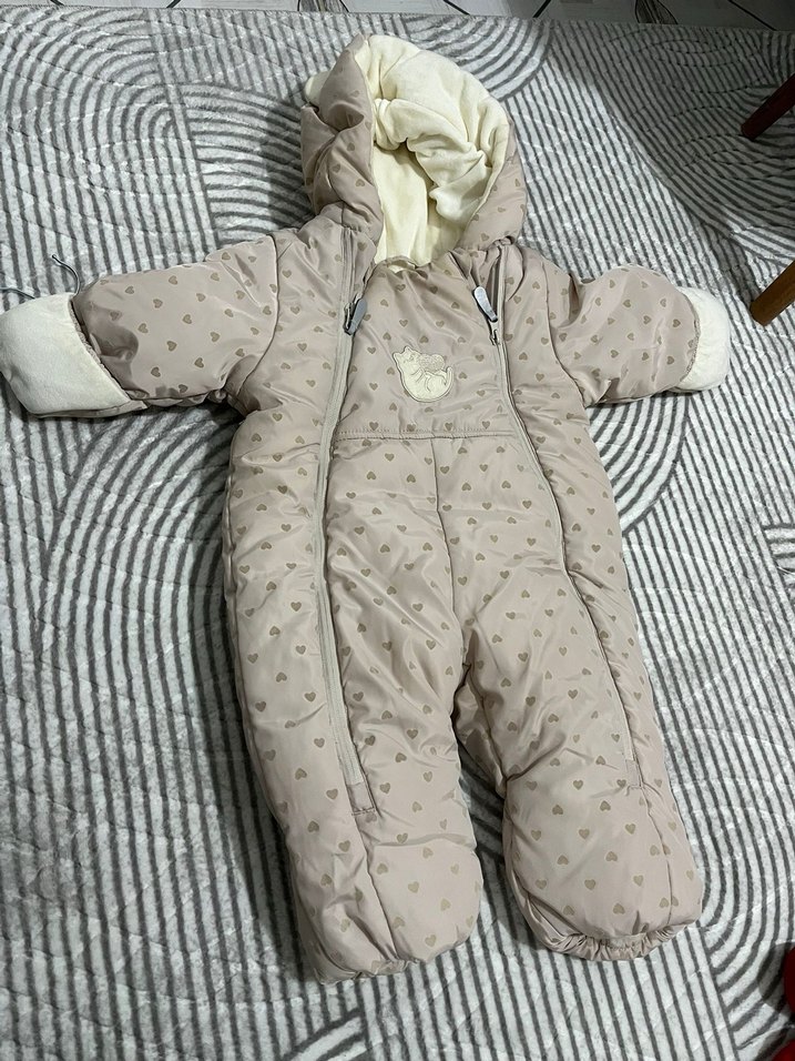 Kahverengi, kürklü detaylı, notched lapel yakalı kız bebek tulumu. Yumuşak, sıcak kumaş ve kapüşonlu tasarım. ❄️