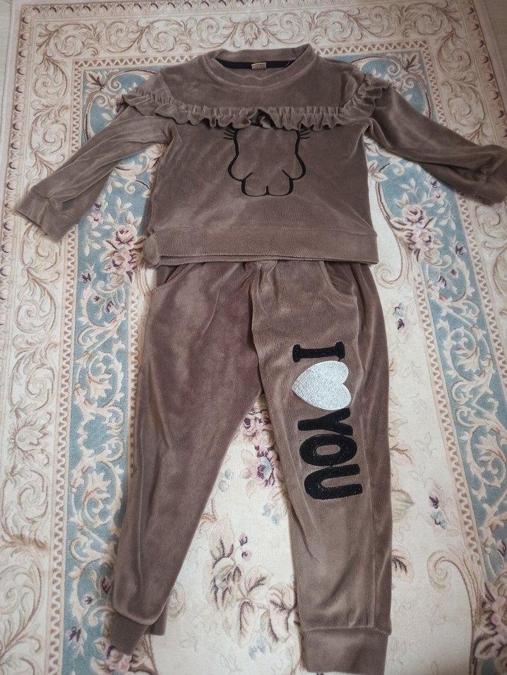 Kahverengi uzun kollu üstü dantel ve nakış detaylı, altı "I love you" nakışlı yumuşak kumaştan kız bebek takım. ❤️