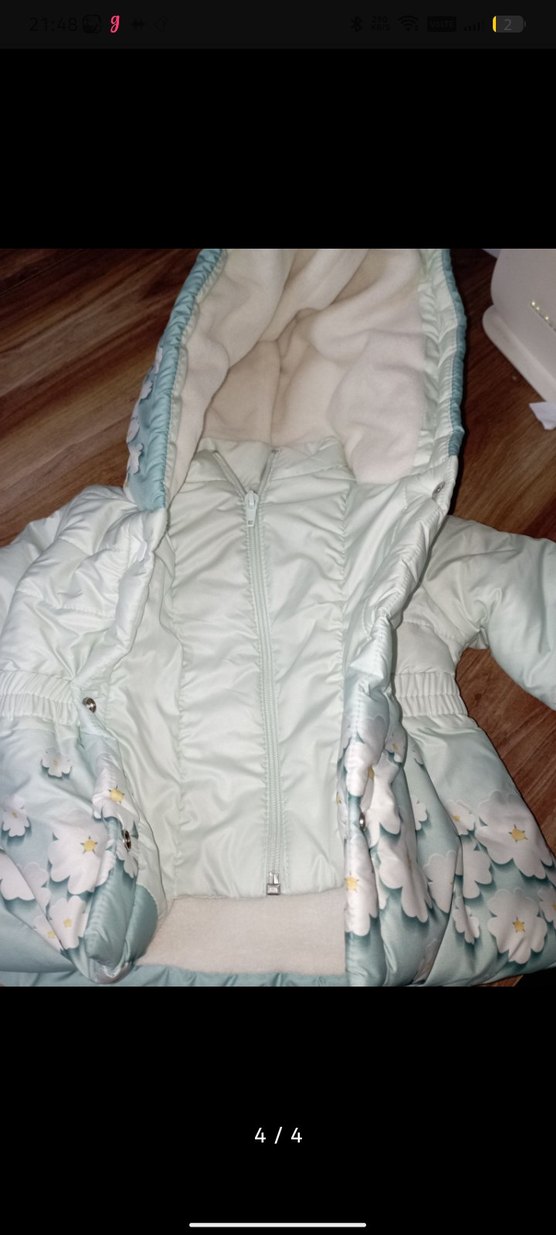 Kapüşonlu, kürklü detaylı kız bebek montu. Pastel beyaz renkte, alt kısmında hafif çiçek desenli, sıcak ve rahat bir tasarım. ❄️ eldivenlidir. 6-9 ay