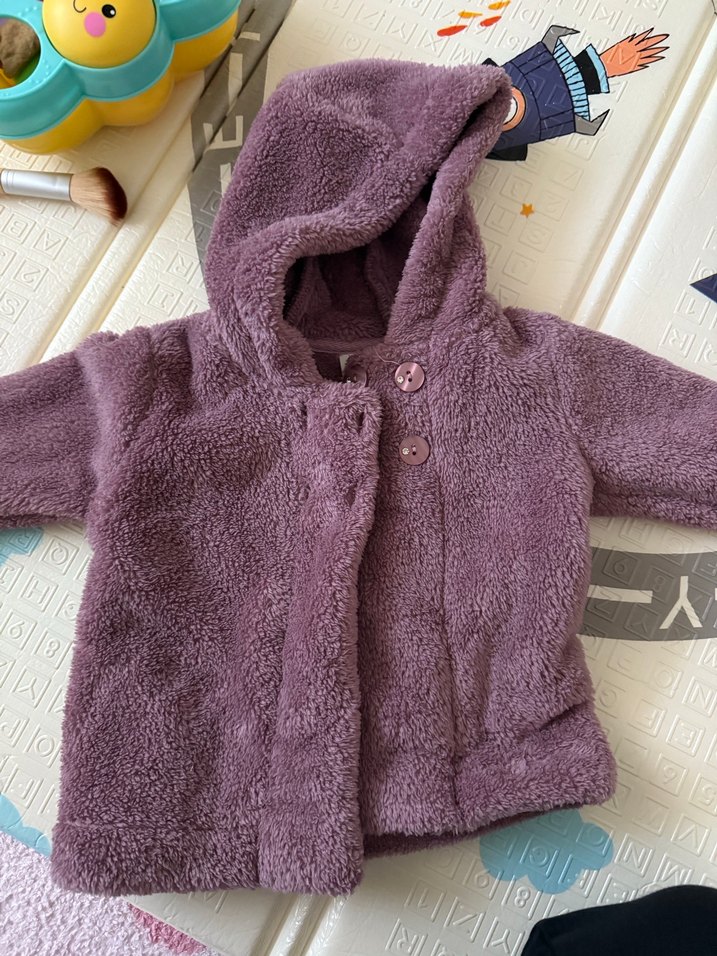 Hiç kullanılmadı.Kapüşonlu ve düğmeli, yumuşak ve sıcak kumaştan yapılmış, düz mor renkli kız çocuk montudur
