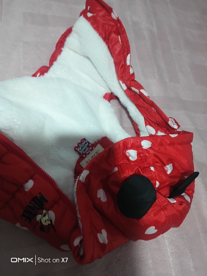 Kırmızı, kapüşonlu kız bebek tulumu, fermuarlı ve kalp desenlidir. İç kısmı yumuşak ve sıcaktır. ❄️ hiç giyilmedi sadece etiketi yok üzerinde
