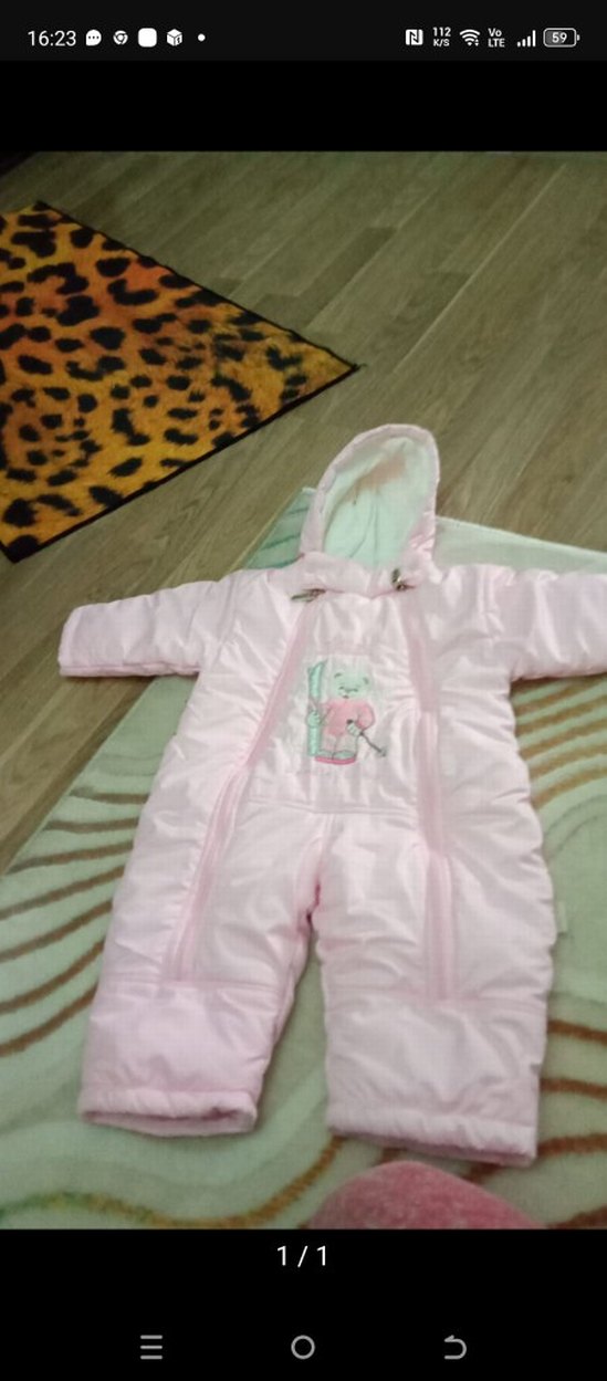 Pastel pembe kız bebek tulumu, kapüşonlu ve fermuarlı, nakışlı detaylarla süslenmiştir. ❄️