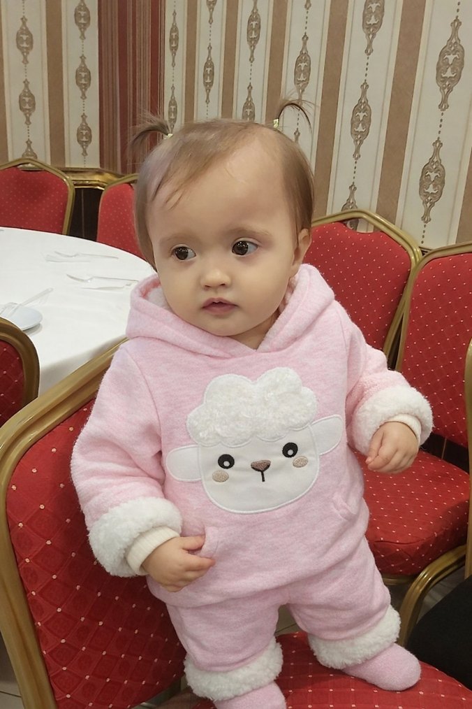 Kapüşonlu, pastel pembe kız bebek tulumu, işlemeli kuzu deseni ve yumuşak kürk detaylara sahip.