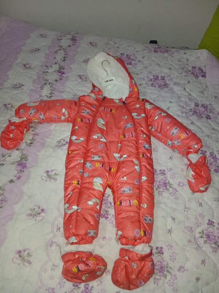 Kapüşonlu, kürklü detaylı renkli desenli kız bebek tulumu. Soğuk havalarda tam koruma için eldiven ve patik içerir. ❄️şu ve soğuk geçirmez 1 kaç kez kullanıldı yeniden farksız diğer çocuk ürünlerinide inceleyin