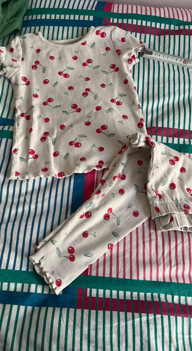 Beyaz kiraz desenli kız bebek takımında piliseli detaylı kısa kollu üst ve uyumlu pantolon bulunur. Yumuşak pastel tonlardadır.