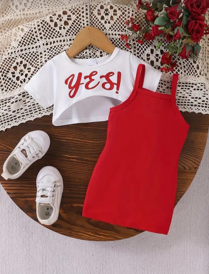 Kırmızı askılı elbise ve beyaz baskılı kısa tişörtten oluşan kız bebek seti. Rahat ve şık tasarımıyla öne çıkar.