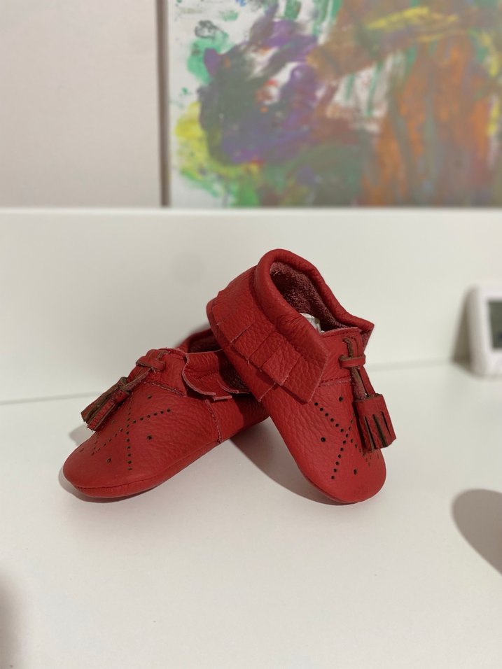 Kız bebekler için kırmızı deri püsküllü, yumuşak ve renkli bohem tarzda ilk adım ayakkabısı.18 19 20 21 numaraları mevcut yılbaşına özel fiyat.