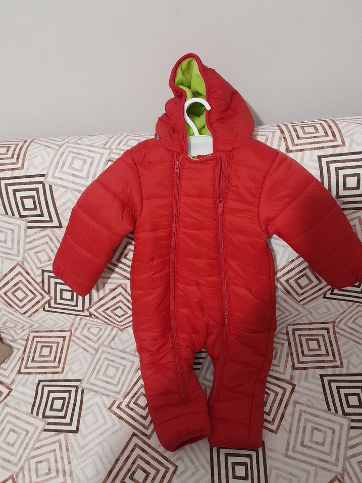 Kapüşonlu, çift fermuarlı kırmızı kız bebek tulumu. Notlu yaka tasarımı ve yumuşak, sıcak kumaşla konfor sağlar. ❄️
