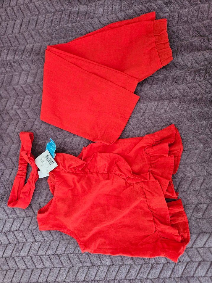 Renkli kırmızı kız bebek takımı, fırfırlı kolsuz üst ve uyumlu pantolondan oluşur. Takımda saç bandı da bulunur.