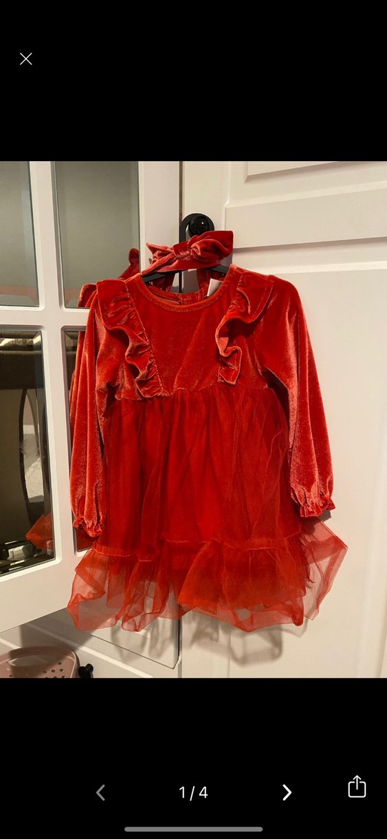 Koyu kırmızı renkte, süet kumaştan yapılmış, uzun kollu ve fırfırlı detaylı kız çocuk elbisesi. Oturmalı kesimi ve tül detaylı katmanlı etek kısmı bulunur. Sadece 1 kez giyildi bandanası ile göndereceğim yeni gibi