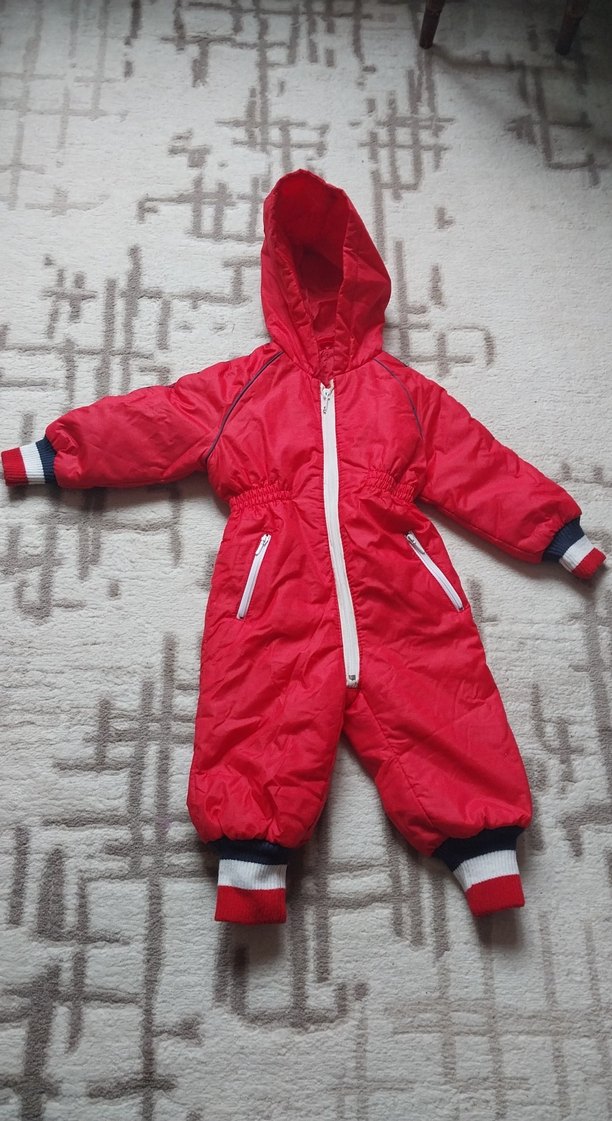 Kapüşonlu, fermuarlı kırmızı kız bebek kayak tulumu. Elastik bel ve renkli çizgili manşetlerle rahat oturur. ❄️ omuzdan boy ölçüsü 69 cm iki koltuk arası 30 cm bel lastiklidir zaten