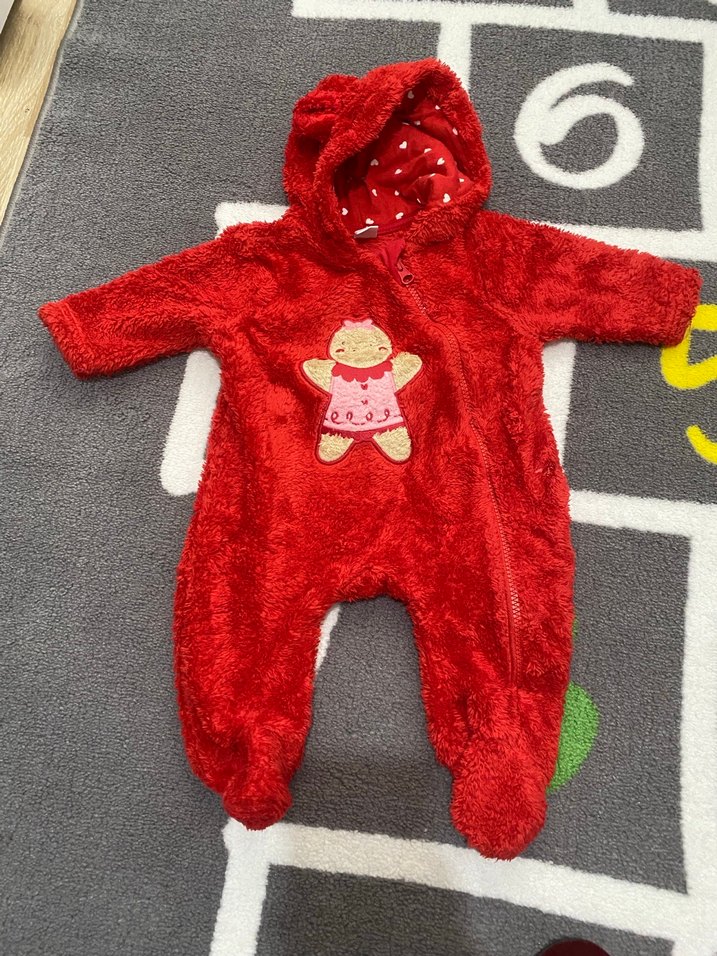 Canlı kırmızı renkli, kapüşonlu örme kumaştan yapılmış kız bebek kar tulumu. Önünde işlemeli desen ve tam boy fermuar bulunur.