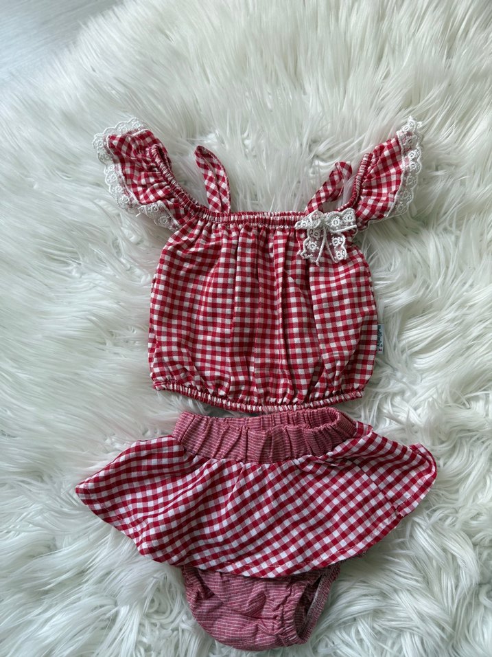 Renkli kırmızı kareli desene sahip kız bebek takımı, fırfırlı ve kolsuz üst ile etekli alt parçadan oluşur. Canlı bir görünüm sağlar. 1 kez giyildi hiç bir sıkıntısı yoktur