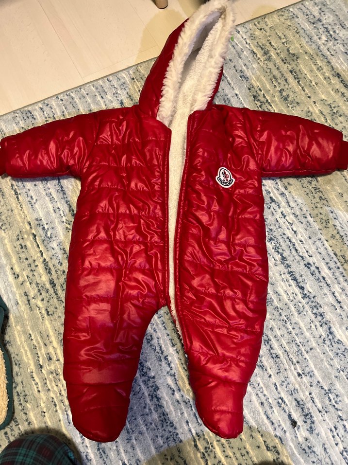 Parlak kırmızı renkte, kapüşonlu ve yumuşak kürk detaylı kız bebek tulumu, soğuk havalar için sıcak tutar.