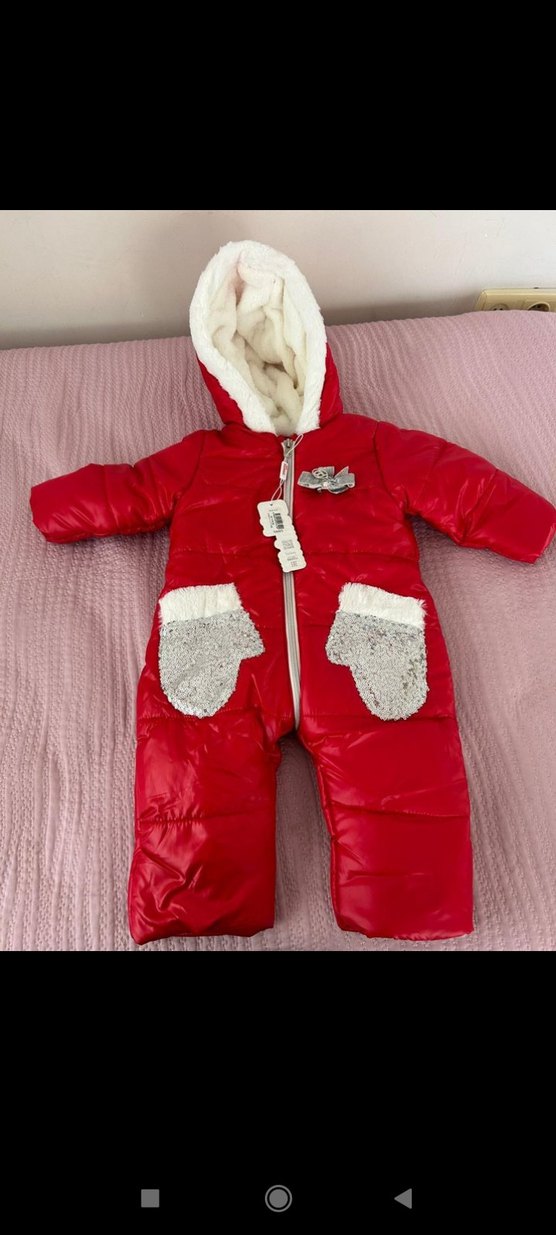 Parlak kırmızı kız bebek kar tulumu, kürk detaylı ve yakası kesikli. Önünde sıcak tutan eldivenler bulunur. ❄️