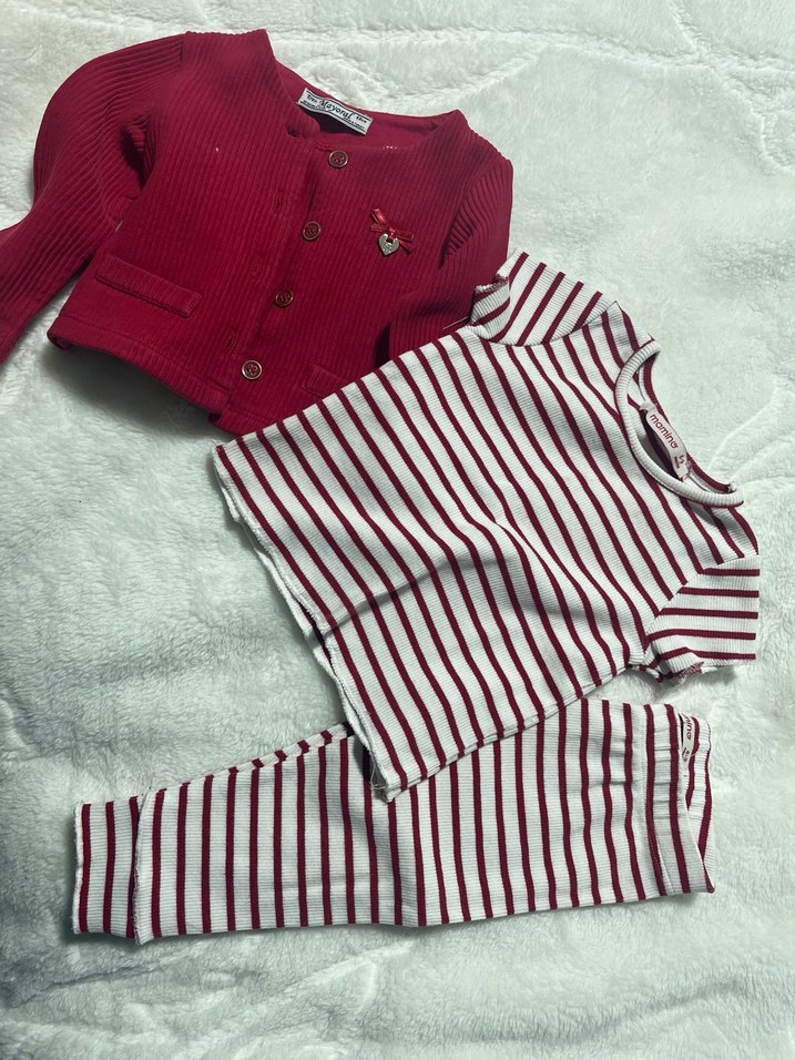 Kız bebek için uzun kollu kırmızı örgü hırka ile kırmızı-beyaz çizgili üst ve pantolon takımı. Canlı ve rahat bir görünüm sunar. Marka temsili