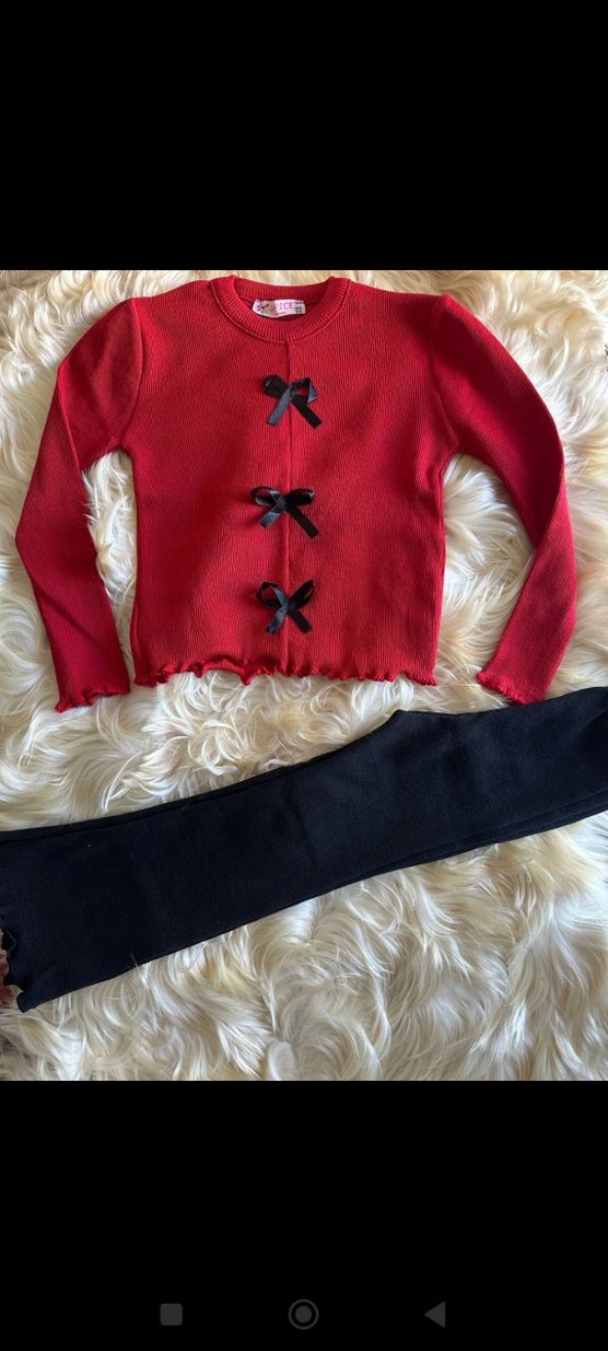Koyu kırmızı renkte örgü uzun kollu kazak, siyah fiyonk detaylı ve siyah tayttan oluşan sade kız bebek takımı.