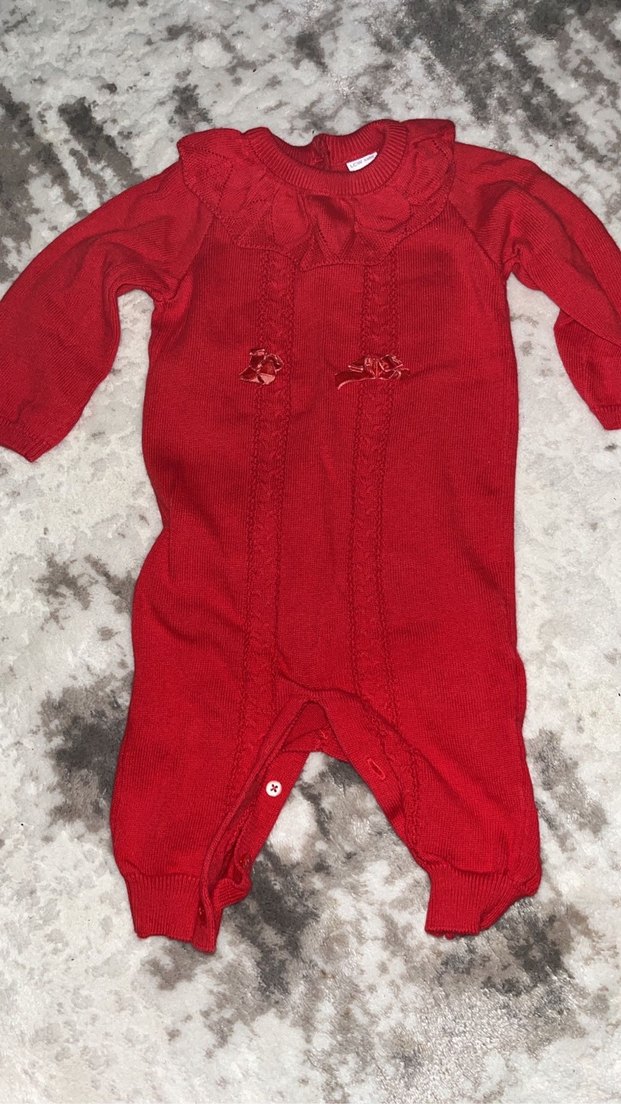 Koyu kırmızı renkli, örgü kız bebek tulumu. Uzun kollu, fırfırlı yakalı ve önünde küçük kurdele detayları bulunur. Yumuşak dokuludur.