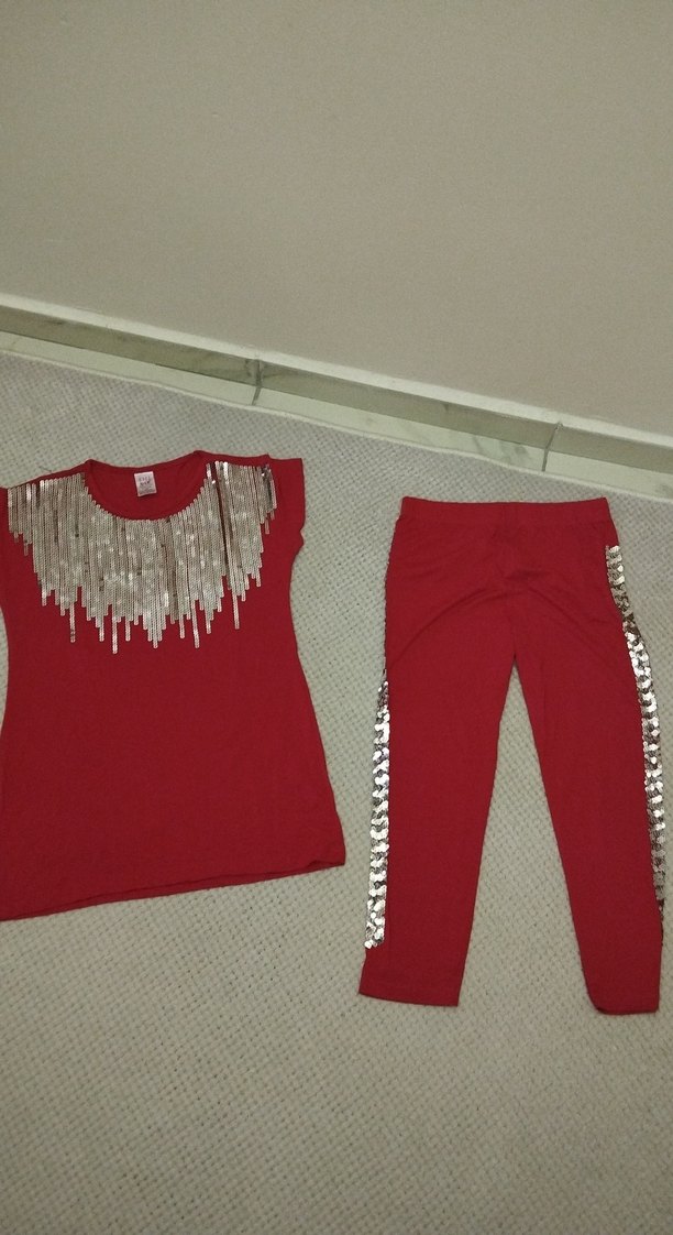 Kırmızı, payet işlemeli kolsuz üst ve payet şeritli kırmızı pantolondan oluşan renkli takım. 12-13 yaşa uyumludur.