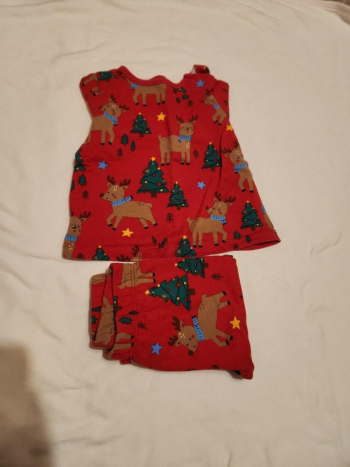 Kız bebek için , kırmızı renkli, örme dokulu pijama. Geyik ve ağaç desenli, yuvarlak yakalı, sıcak tutar. Çok az kullanıldı, herhangi bir deformesi yok