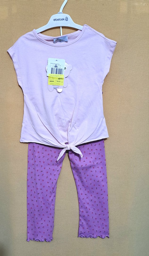 kolsuz ön bağlamalı üst ve pastel mor batik desenli tayt ile rahat ve şık kız bebek takımı.