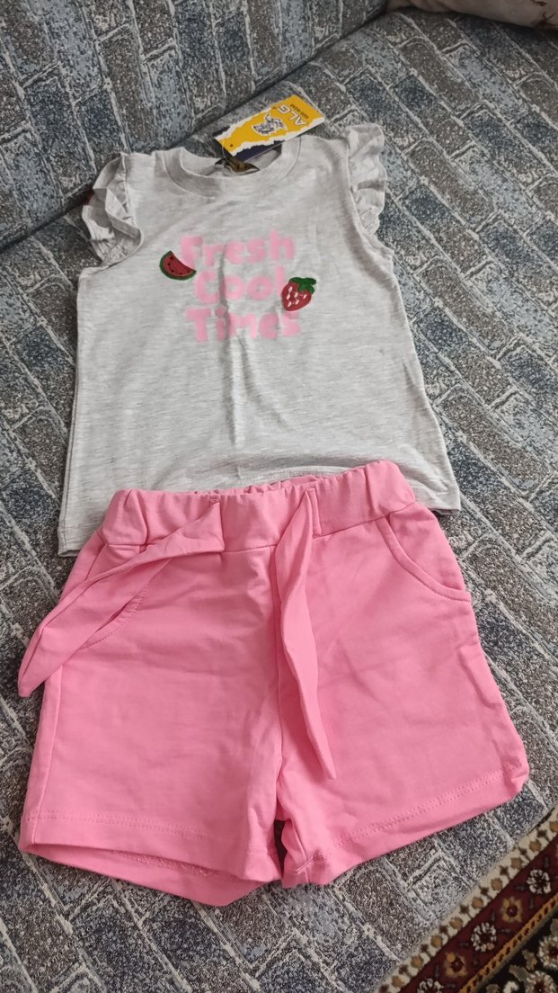 Kısa kollu, meyve baskılı gri üst ve kemerli pembe şortlardan oluşan kız bebek takımı.