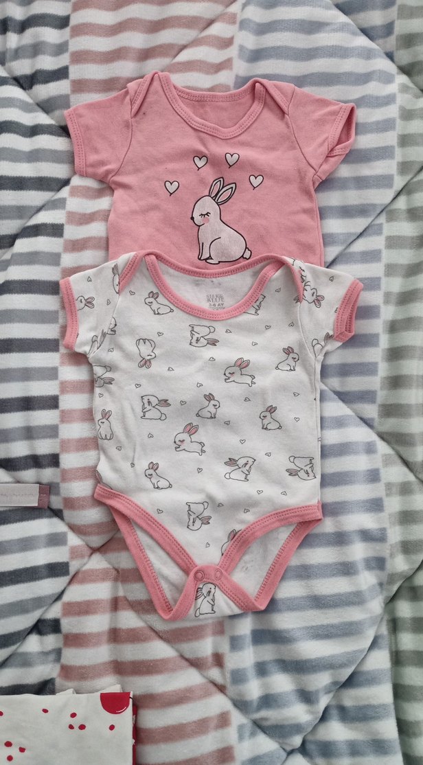 Kısa kollu, pastel renklerde kız bebek body seti. Biri pembe, kalp ve tavşan desenli, diğeri beyaz pembe kenar detaylı tavşan baskılı. Kolay giydirme için çıtçıtlı.