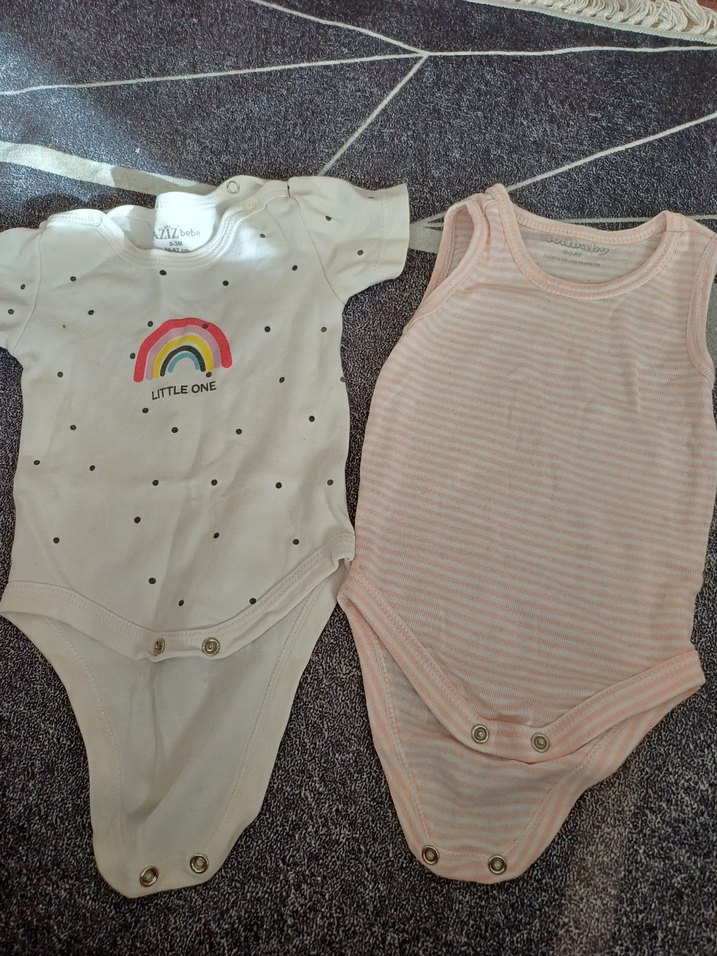 Kısa kollu, straplez, çıtçıtlı kız bebek body. Beyaz ve pastel tonlarda, biri gökkuşağı baskılı, diğeri çizgili.