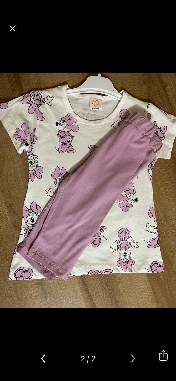 Kısa kollu, baskılı mor kız bebek takımı, Üst ve mor pantolondan oluşur. ürün hiç kullanılmamış sıfırdır. Görseldeki 6 yaştır.
