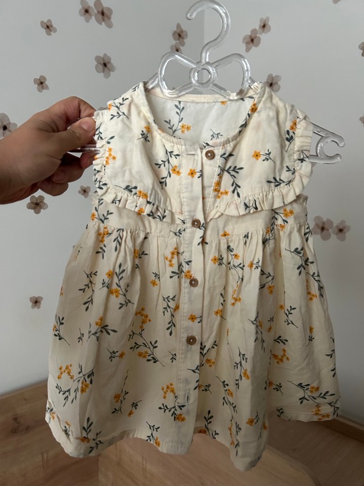 Kolsuz, straplez yaka ve düğmeli ön detaya sahip bol kesim elbise. Beyaz tabanlı, çiçek desenli hafif keten kumaştan yapılmıştır.
