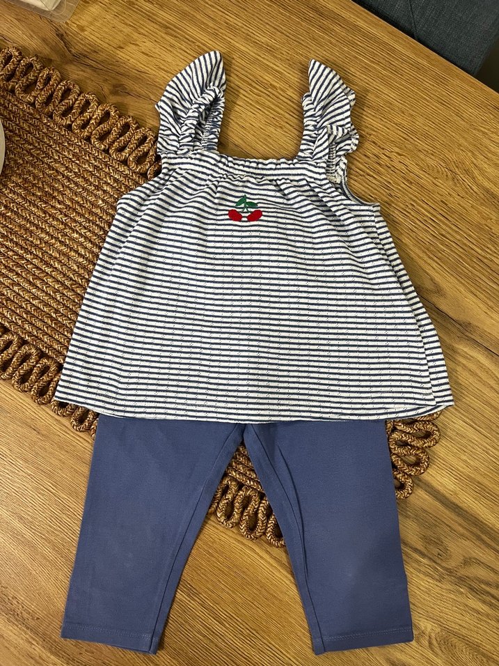 Kolsuz, fırfırlı omuzlu ve kiraz nakışlı gri çizgili üst ile mavi taytlı kız bebek takımı.