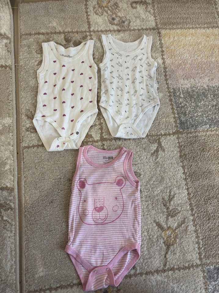 Üç adet kolsuz, örme kız bebek body. İki beyaz küçük desenli, biri pembe çizgili ve ayı figürlü. Hepsi çıtçıtlı ve straplez yakalıdır.