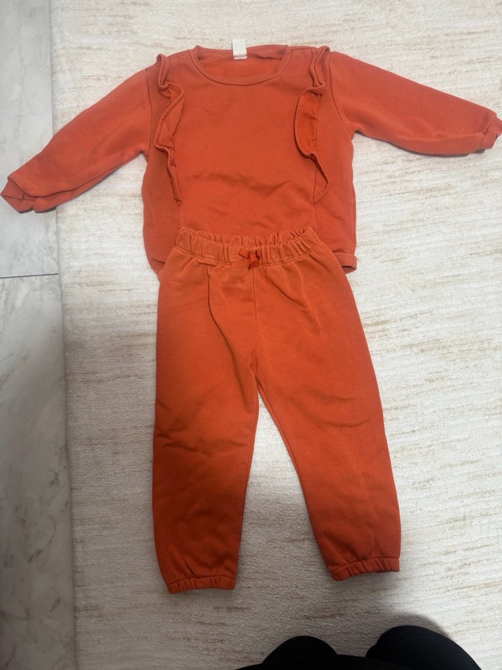 Koyu kırmızı renkli, uzun kollu fırfırlı üst ve lastikli bel pantolondan oluşan bebek kız takımı. Rahat ve yumuşak kumaş.