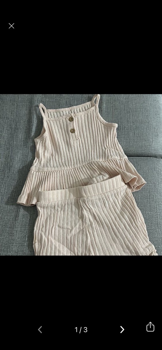 Krem rengi pilili, kolsuz üst ve pantolondan oluşan kız bebek takımı. Üstte düğme detayları bulunur.