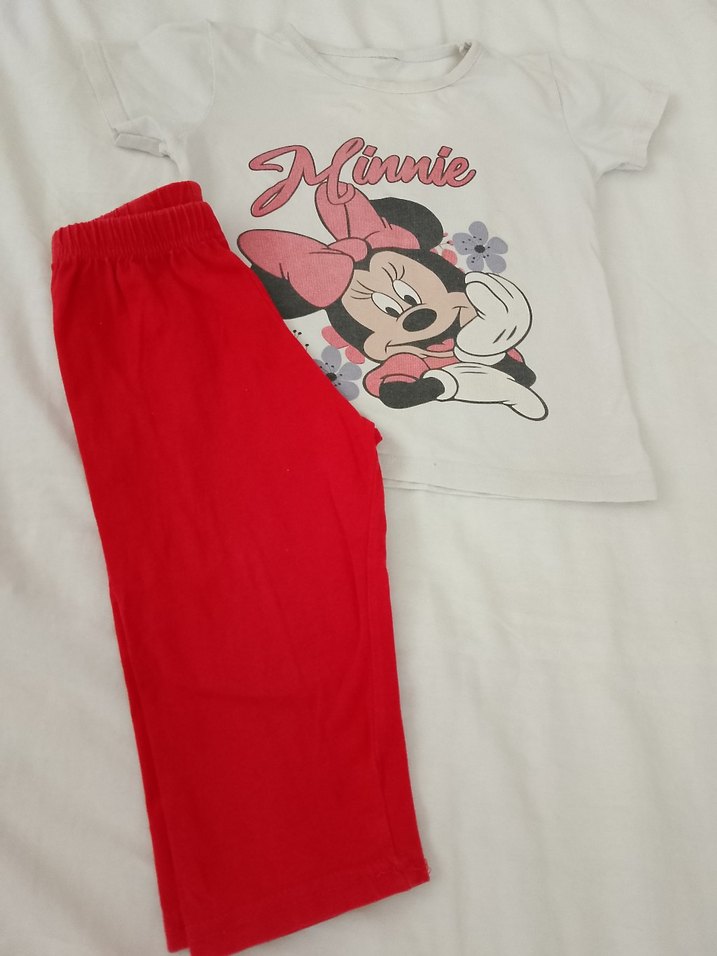 Beyaz kısa kollu üstte renkli Minnie Mouse baskısı ve canlı kırmızı pantolon bulunan kız bebek takımı. Rahat ve eğlenceli tasarım.