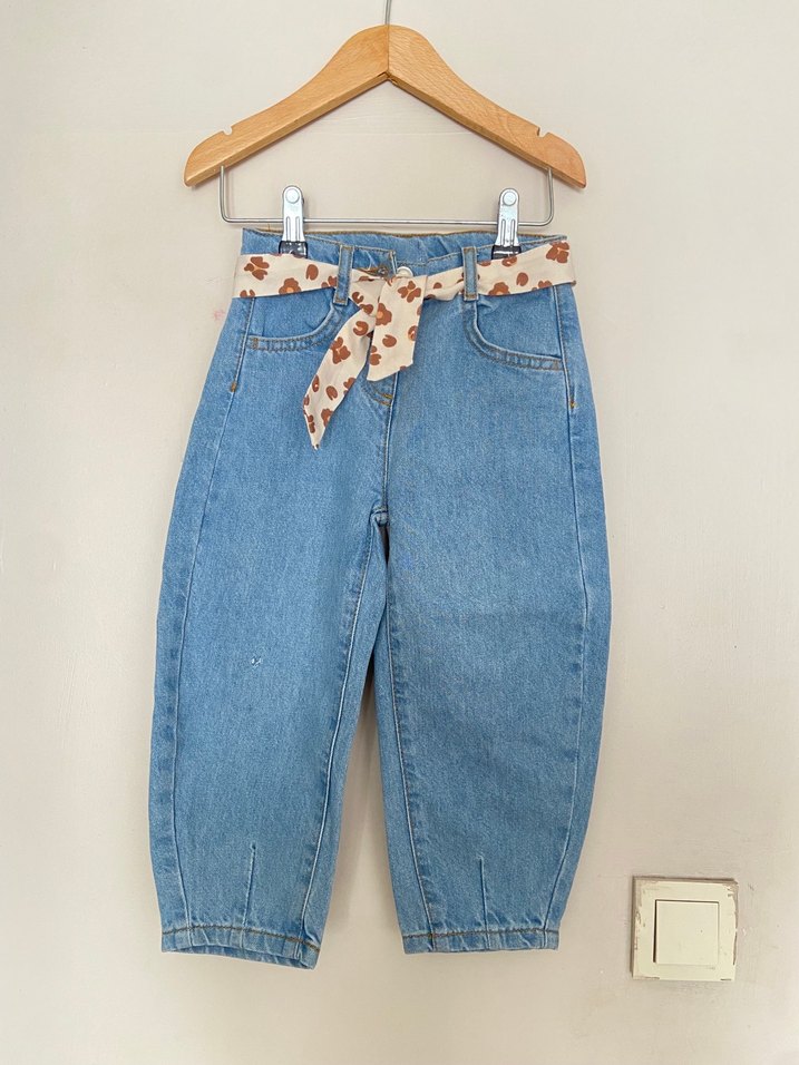 Kemerli, bol kesim mavi denim kız pantolonu, pastel tonlarda bağlamalı çiçek desenli kemerle. Sokak stili için uygun. ufacik bi sokulmuslk var ama hic belli bile olmuyor yeni urun kullanilmadi